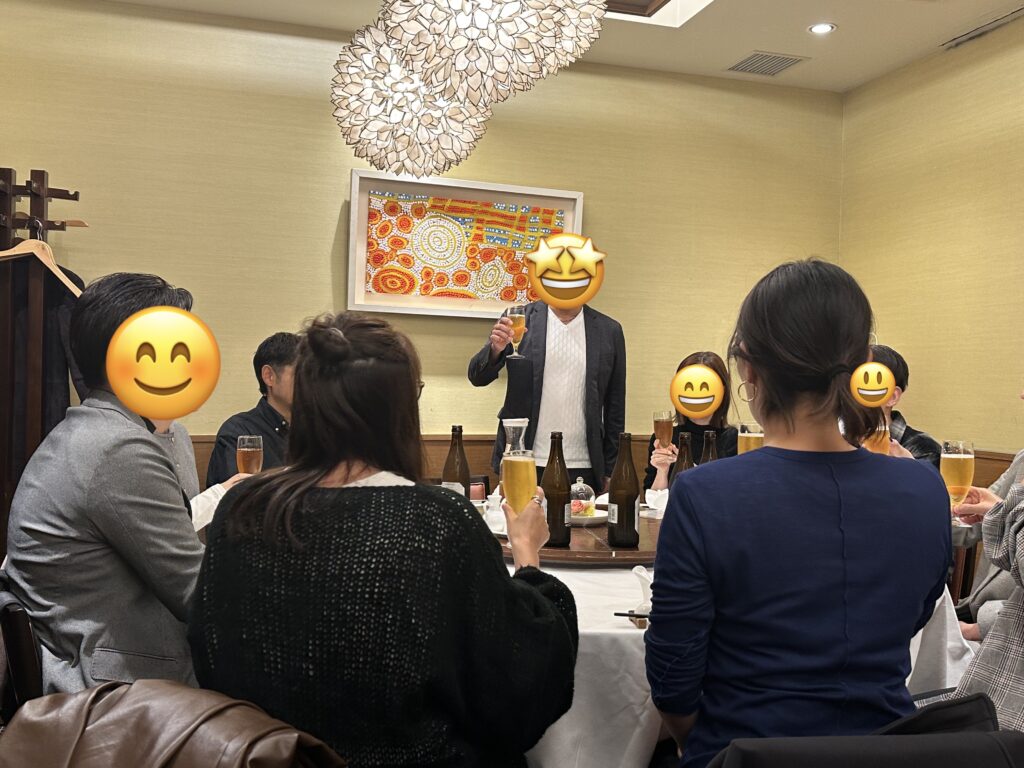 美味しい料理を味わいながらの歓談タイム。仕事の話からプライベートの話まで、部署を越えて盛り上がるのがこの会の醍醐味です。