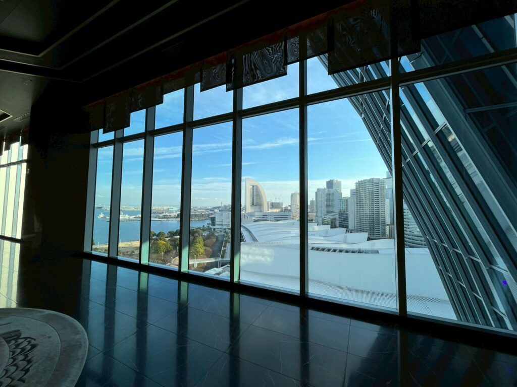 受付(14F)は最上階に位置しており、横浜港を遠くまで見渡せるようなガラス張りの構造。